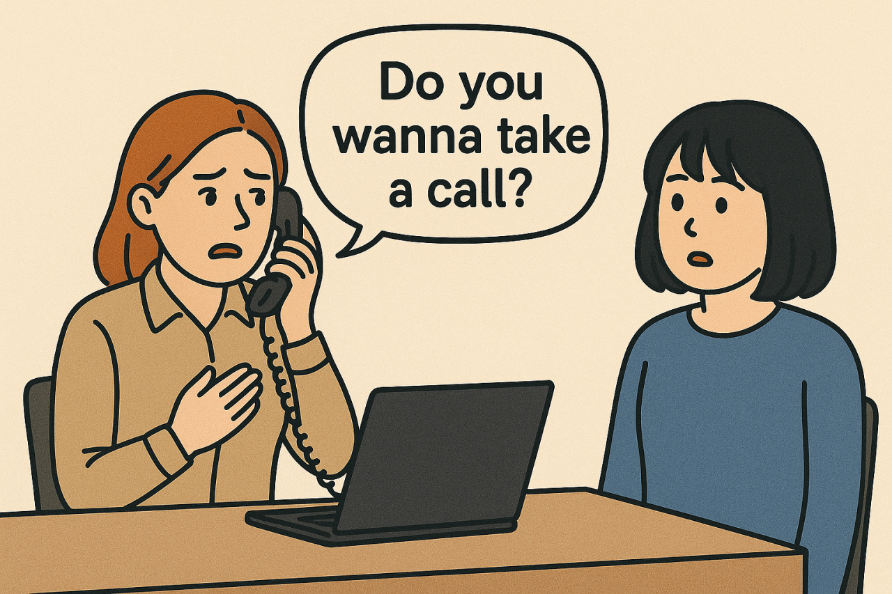 日本語の感覚だと、「Do you wanna take a call?」=この電話取りたい?と聞かれてるような気がして「ん??取りたくはないけどなぁ」と思ったことがありました😂